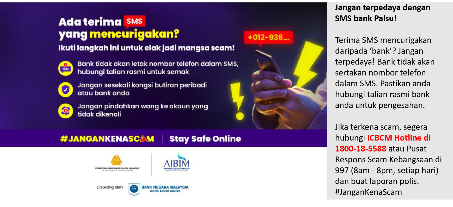 收到来自“银行”的可疑短信?千万别上当!银行不会在短信中附上电话号码。请务必联系您的银行官方电话以确认。如果您不幸掉入诈骗陷阱,请立马拨打 ICBCM 热线:1800-18-5588 或国家诈骗应对中心热线:997 (每天8am-8pm)并报警。#JanganKenaScam